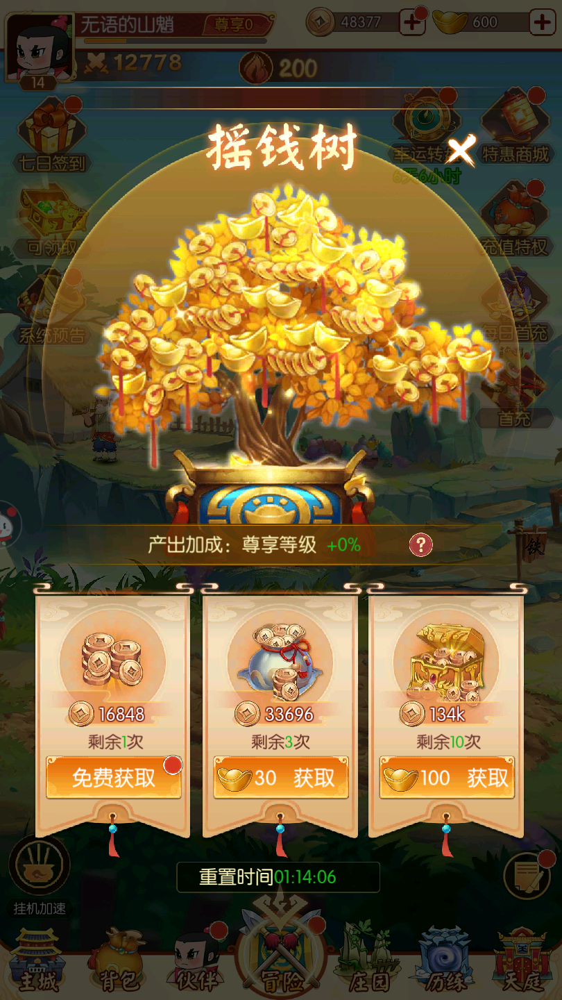 作为新手,主要任务是提升伙伴等级,这决定了你与其他玩家pk的时候能不能打得过,而提升英雄等级需要两种材料:铜币、经验葫芦与紫金丹。铜币的话看似很多,但实际不禁花,伙伴提升等级消耗巨大,所以还是且花且珍惜,除了常规的冒险推图等玩法获得铜币,别忘了还有一个摇钱树的功能,在元宝允许的情况下,建议把兑换铜币的机会全都拉满,到了后期,你一定会回来感谢小编的。