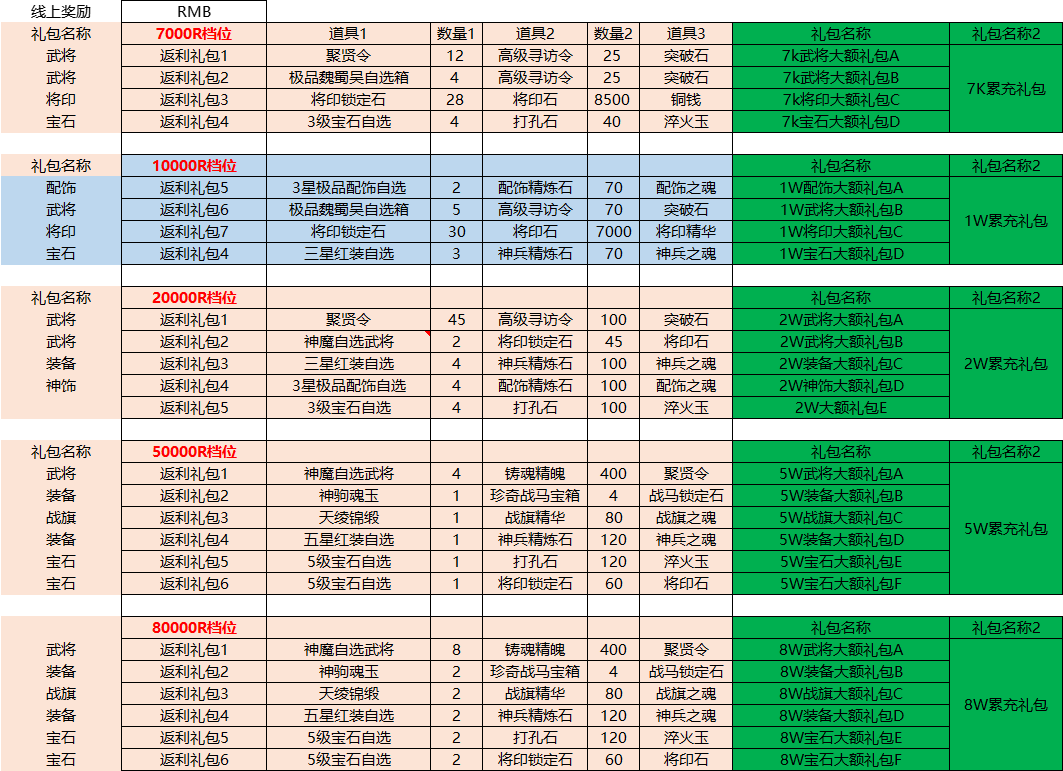 活动内容:周一到周日充值累计,只能领取最高档位的奖励(礼包选其一)