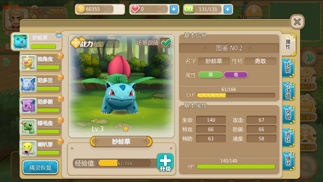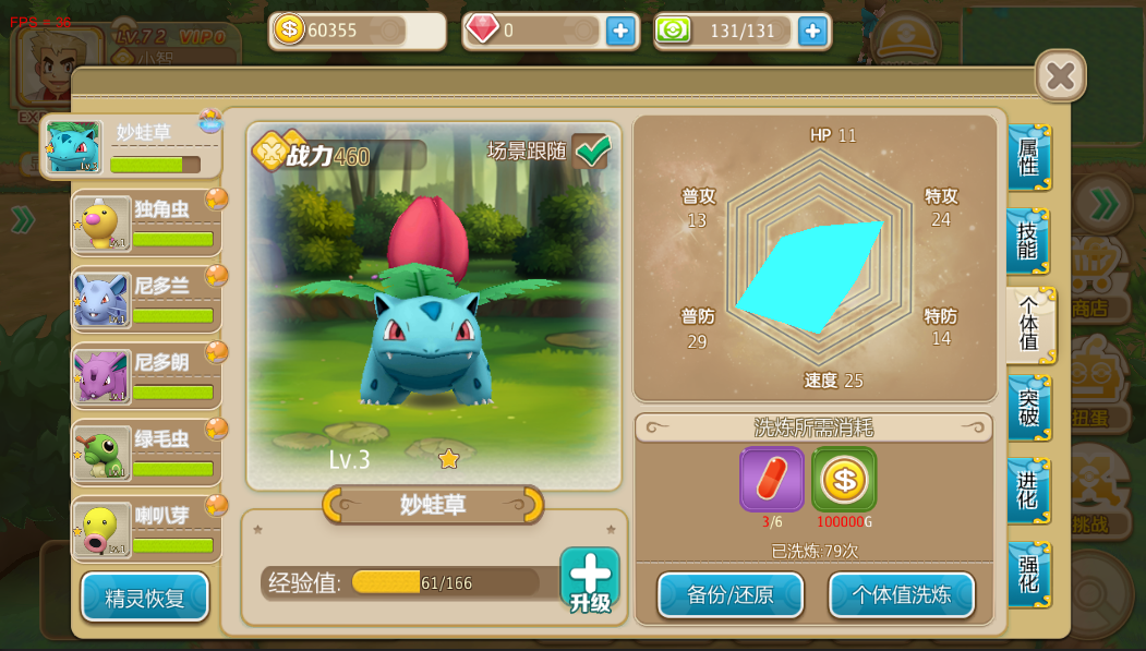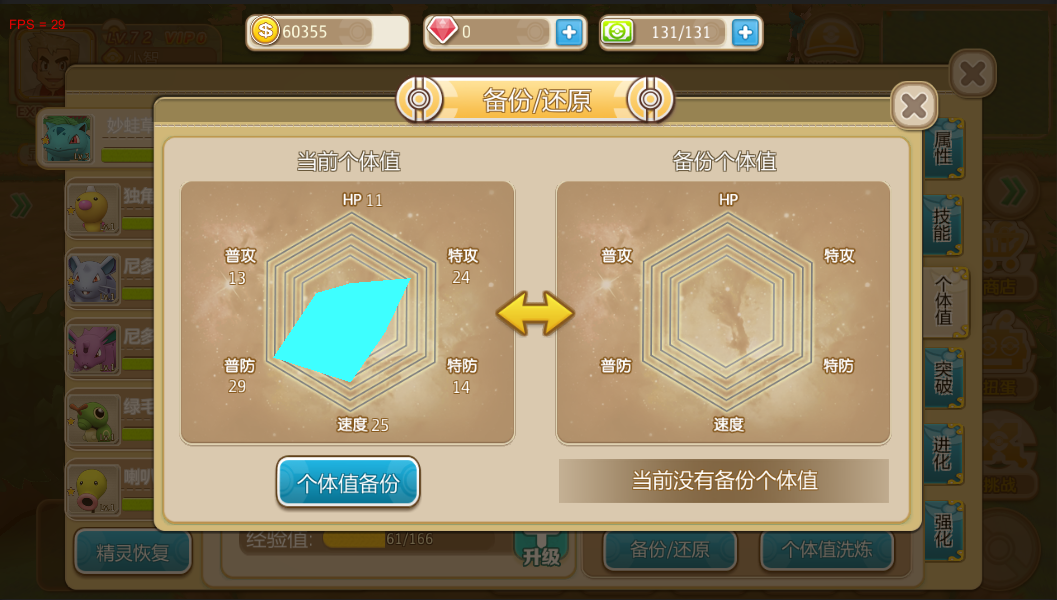 每个精灵都将拥有对应六项基础属性的个体值,个体值的数值将作为一个系数,给其六项基础属性提升加成,玩家可以通过“个体值洗练”,消耗特定数量的洗练素材以及金币,重新生成其六项(每项个体值的最小值为1,最大值为31);