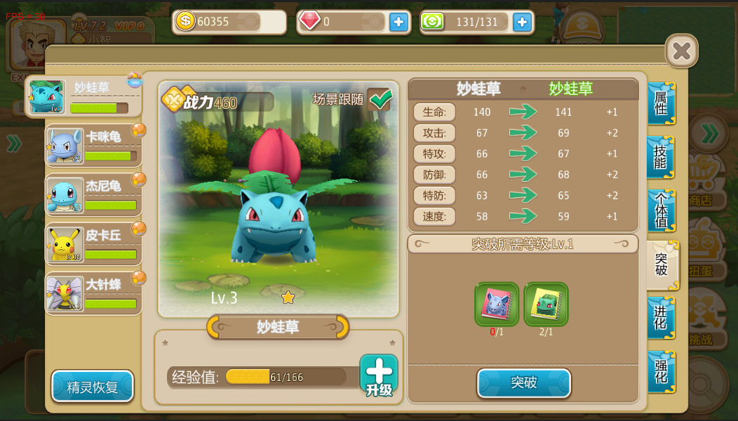 玩家通过精灵突破,即可改变精灵的品质(按照“白色”->“绿色”->“蓝色”->“紫色”的顺序来进行提升),要提升精灵的品质,要达成下列三个条件: