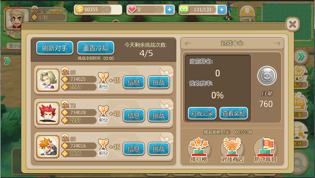 玩家可通过虚拟对战中心,挑战其他口袋妖怪训练家,每个玩家每天都将拥有特定数量的挑战次数,当成功击败其它训练家时,将能获得积分的加成,反之则扣除掉一定的积分,玩家所获得的总体积分将决定玩家的评级以及具体排名,系统将根据评级以及排名的具体情况,按日度以及月度两种不同的方式,给玩家发送奖励(主要为水晶以及竞技场场货币),同时的,评级还将影响到玩家在虚拟对战中心商店中购买物品的资格;