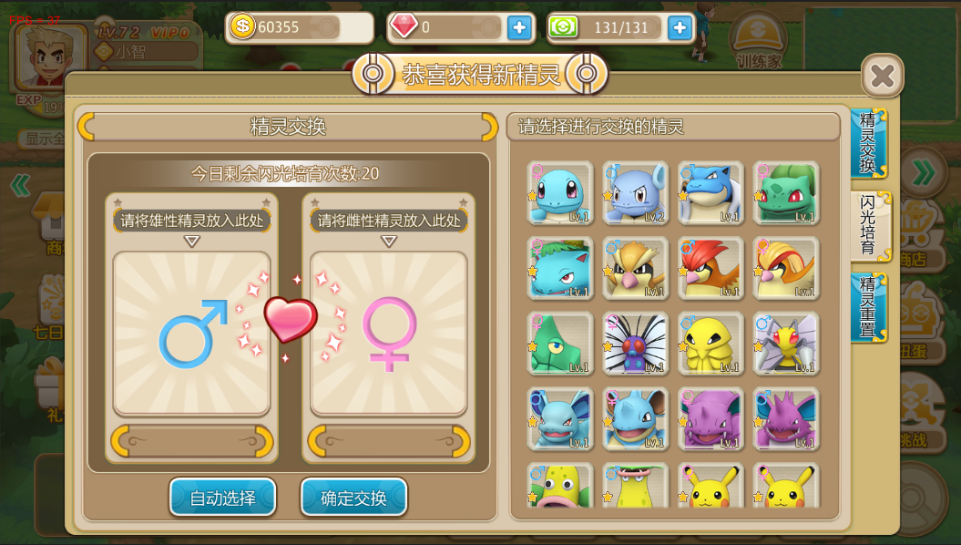 “闪光培育”系统,也是精灵回收系统的一部分,其具体作用是将两个同种种类但不同性别的精灵放在一起进行交配,交配成功后,将重新生成一个新的同种种类精灵的后代,同时有一定的几率产生变异,出现稀有度极高的“闪光精灵”;