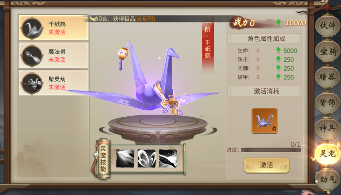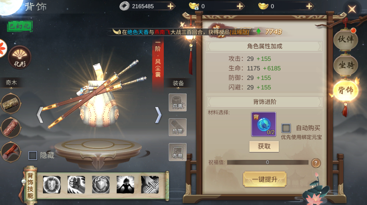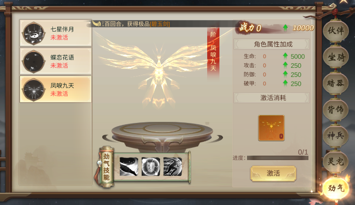 包含坐骑,伙伴,灵宠,神兵,劲气,背饰,暗器七个方面,每个方面皆拥有5个技能,其中1个技能默认开启,另外4个技能只有达到指定阶数才可激活。每个方面拥有多个化形形象,使用对应形象的道具可激活与升级对应的化形形象。化形形象只有阶数,消耗一定数量的对应的形象道具可升阶化形形象。每个化形形象拥有3个技能,只有达到指定阶数才可激活。