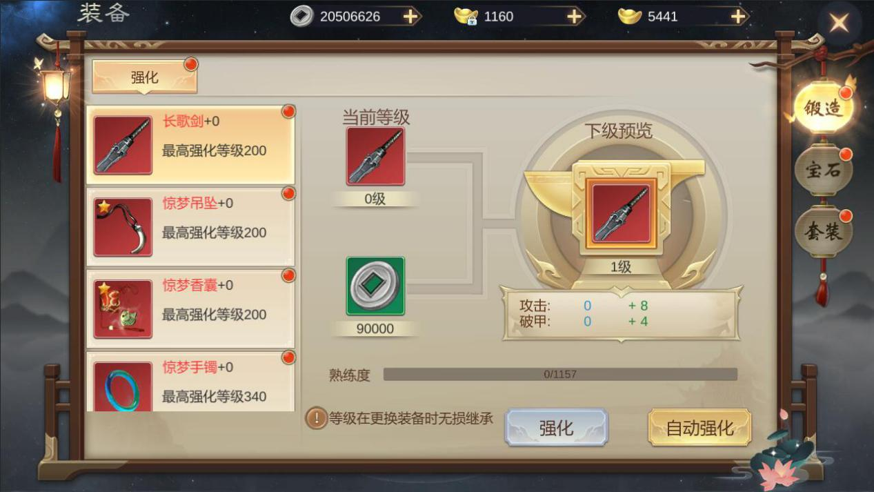 装备强化由主线开启,花费一定的金币即可强化装备等级,强化上限由装备阶数决定。