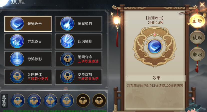 主动技能一共有8个,1个普通攻击,4个普通技能,3个转职技能。只有完成指定的转职任务才可开启。
