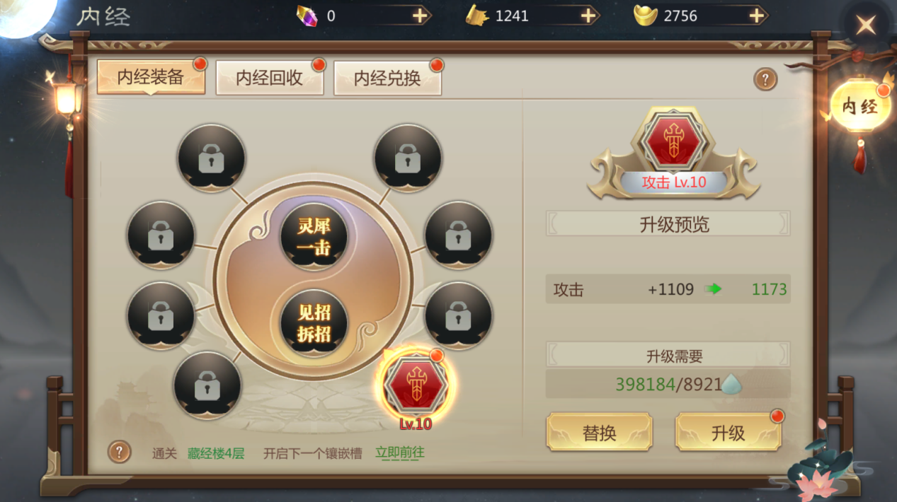 内经系统由主线任务开启,拥有8个镶嵌孔,可镶嵌不同属性的内经,增加主角属性。镶嵌孔默认不开启,只有通关指定层数的藏经阁,才可开启对应的镶嵌孔。