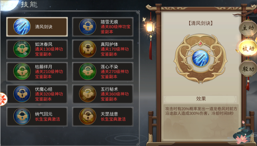被动技能一共有17个,完成对应等级的宝鉴副本、长生宝典、转职任务均可激活对应的被动技能。