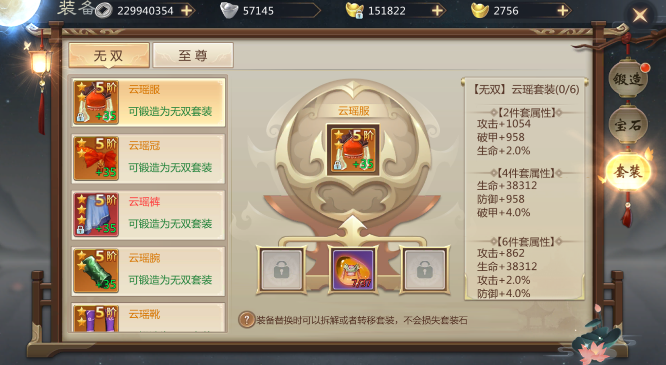 240级开启装备套装,套装分为装备无双套装、饰品无双套装、装备至尊套装、饰品至尊套装4种。激活相同套餐有可激活对应的属性。