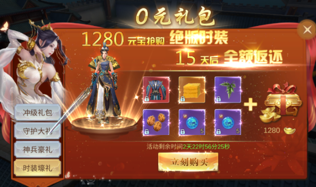 6.到达80级的时候会有比较大的卡级,需要到90级才可以继续主线任务。这时候可以选择挑战神功宝鉴的支线任务,前期挑战可能会失败。升到88级开启0元购的活动,分别有时装、神兵、守护礼包。建议选择时装礼包,不仅仅有提升属性的时装,更有坐骑进阶丹,可以提升坐骑属性,强化战力。
