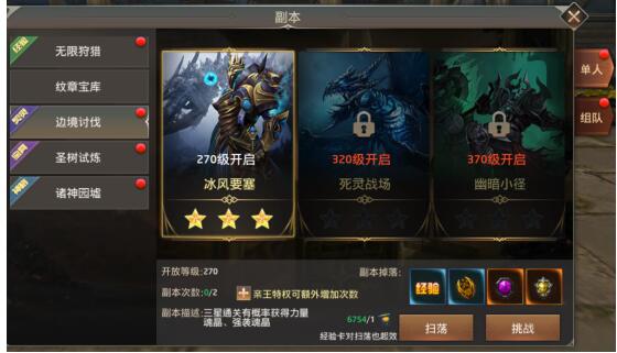 边境讨伐:按角色等级开放讨伐地图,每天可以免费讨伐2次,亲王特权可额外增加次数,三星通关副本有概率获得力量魂晶、强袭魂晶等稀有道具;