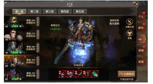 BOSS分为个人、野外、VIP、深渊四个部分。