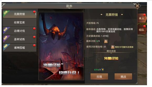 无限狩猎:是角色等级提升的主要途径,每天可以免费参与3次,之后可使用次数增加卷提升次数,特权卡可获得额外经验加成;