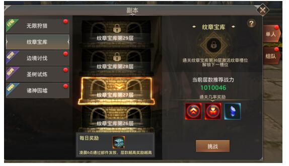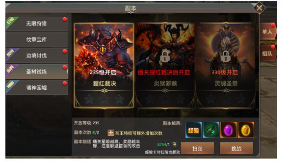 副本分为单人副本和组队副本,每个副本都会产出海量资源用来提升角色战力。