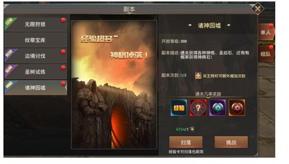 诸神园墟:角色等级达到300级后开放,是游戏内神格是主要来源之一,每天可以免费挑战2次,亲王特权可额外增加次数,通关可获得各种神格、圣启石,还有概率获得神典石;