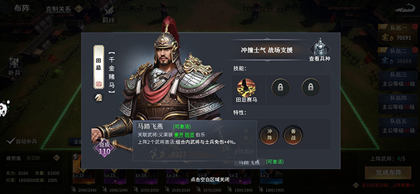 当队伍中有义渠骇、秦开或伯乐时,出发关联技能“马踏飞燕”,对关联武将和士兵有4%的免伤增益,当然前期略有作用,到中期就不太够看了。