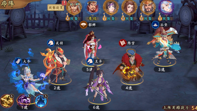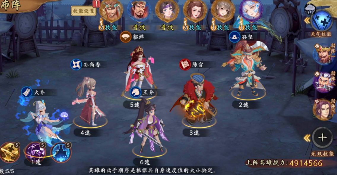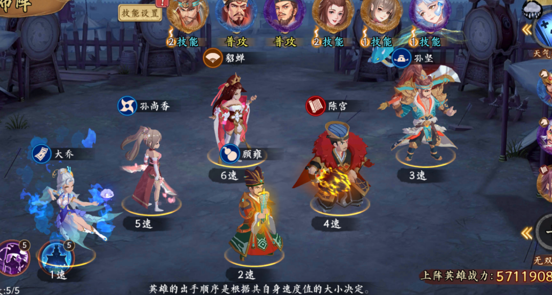 速度配置:大乔1速,孙策比小乔速度快,其余随意。.