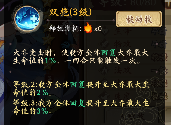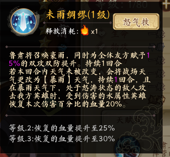大乔先手获得豪雨天气,我方水属性武将将获得豪雨天气加成。