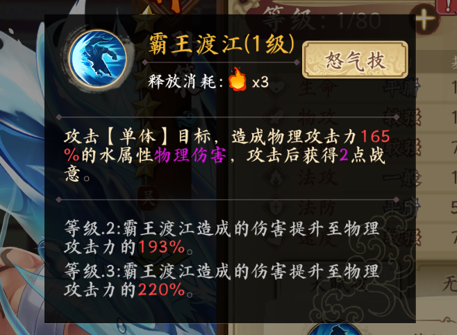 3怒220%单体物理伤害,且攻击后获取2点战意值。