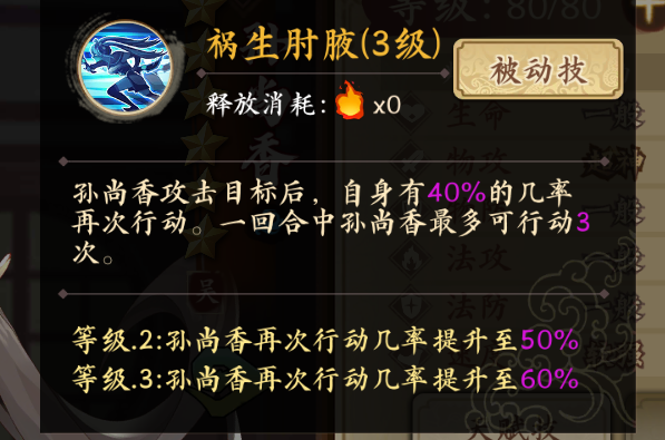 孙尚香成名神技,等级3之后,每次行动有60%概率再次行动,每回合最多行动3次。这个应该描述可以理解为:每次行动后有概率再次行动,最多连续触发2次。这样就非常容易理解了。如果孙尚香连续触发2次再动,总计行动3次,每次造成122%物理伤害,非常强大。如果再携带貂蝉辅助,能让孙尚香又一次行动,会再次激活被动,这样最高就能达到每回合6动,伤害拉满。