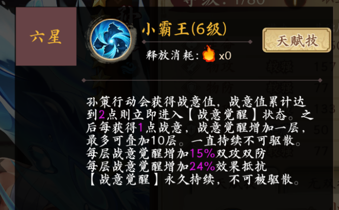 10战意觉醒BUFF,总计150%双攻加成,150%双防加成,240%效果抵抗。达到10层觉醒状态输出很高,非常肉,且能抵抗绝大部分负面状态。