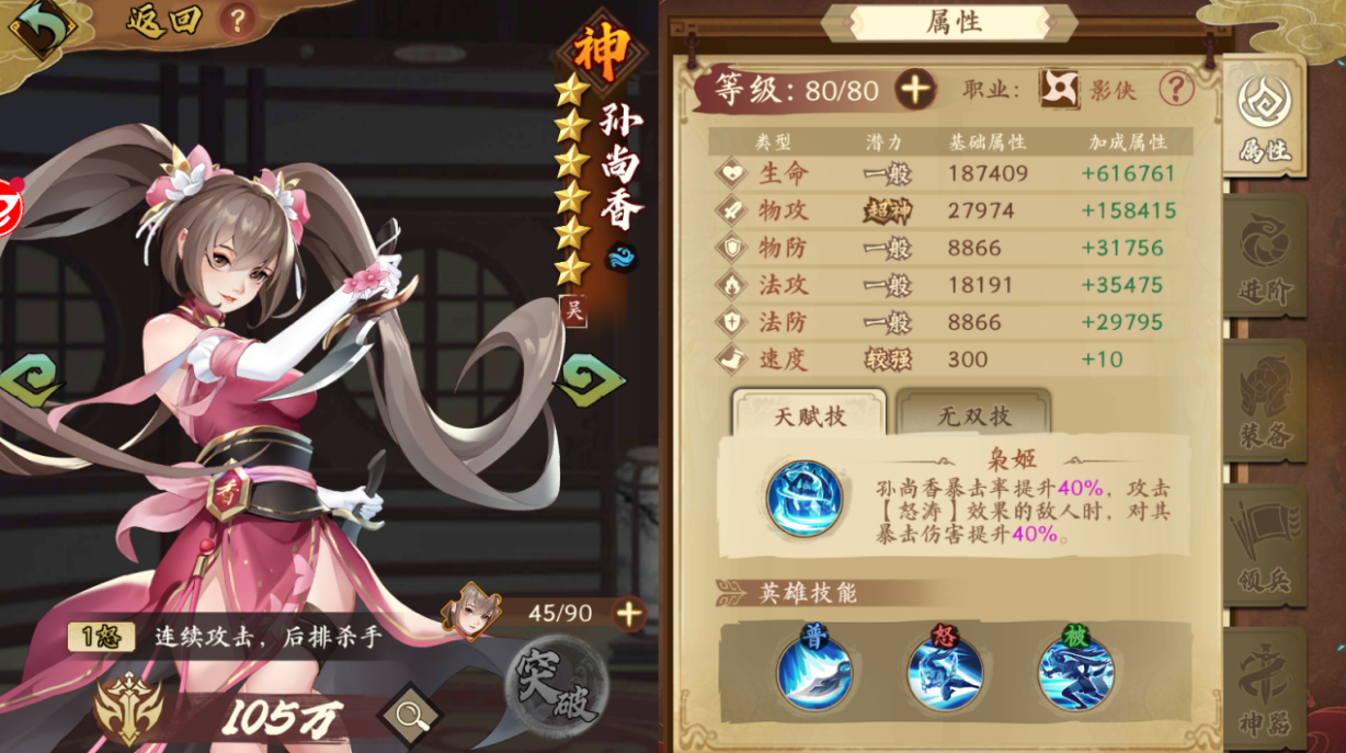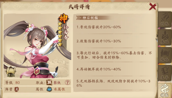 综合评价:孙尚香作为最强刺客,自带40%暴击加多动机制,拥有强力单体切后排能力。培养的话,装备再洗60%暴击即可达到满暴击状况。孙尚香相比其他没有自带暴击率的物理武将培养更容易,非常推荐喜欢水系武将的玩家尝试。