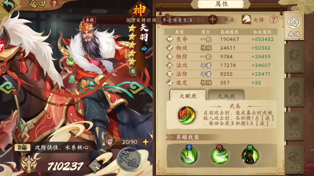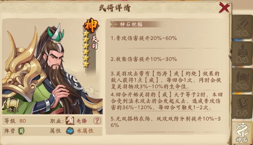 综合评价:关羽PVP非常强,武圣状态附加攻击加成、破防属性、爆伤加成,提升非常巨大。