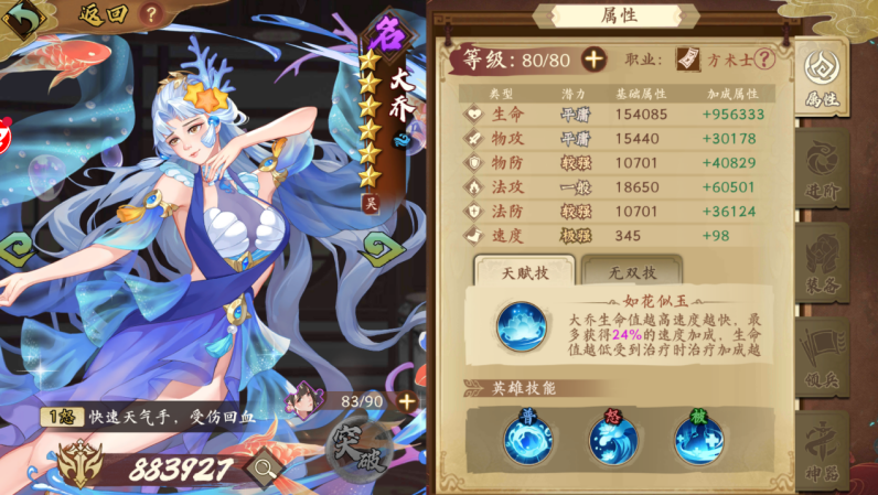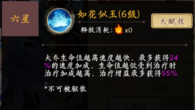 满血时达到最大加成,也就是进入战斗时,开局获得24%速度加成。此天赋决定大乔是快点三国中PVP第一回合速度最快的天气手,仅限第一回合。其他系列的慢速天气手都有被动速度加成,第二回合也可以赶超大乔。