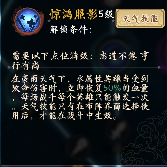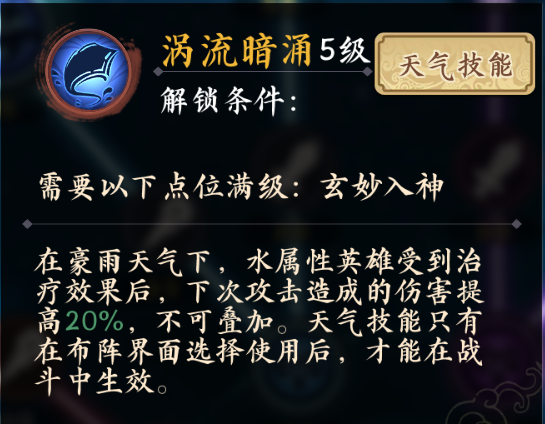 每个系列都有3个对应的天气技能,玩家布阵时只能选择其中一个,天气技能只有在对应天气下才会生效。