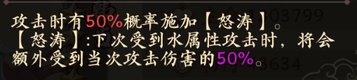 水系武将攻击怒涛造成额外50%伤害,该伤害独立计算,不同于增伤,最终增伤为单独跳出的二段伤害,比如你原来攻击对方的伤害是100W,如果该目标被附加怒涛,那么将会是两段伤害。第一段100W,第二段50W。