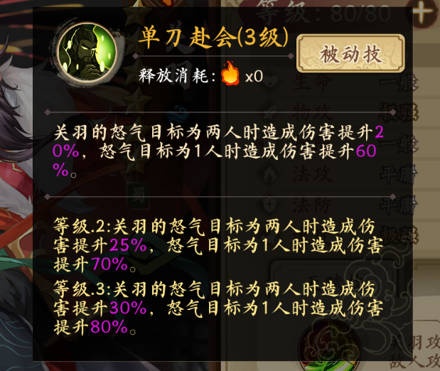 被动技缓解了当关羽横扫前排最后剩下一个高防坦克砍不动的尴尬局面。当关羽杀掉前排2人时,如果还剩下一个高防坦克,那么增伤80%,也能有击杀能力。