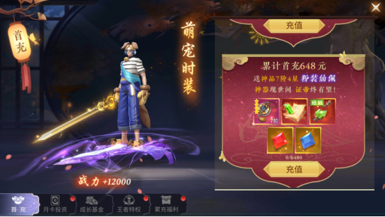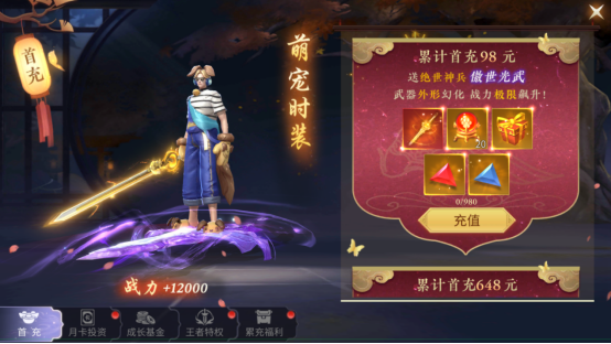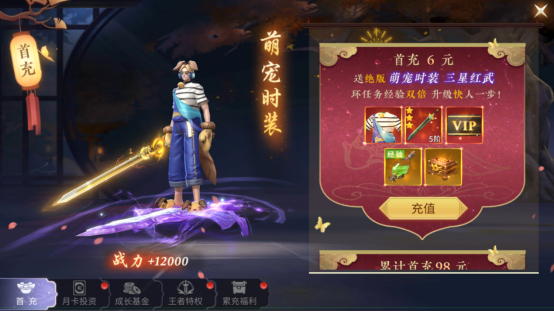 1、首充送绝版萌宠时装、三星红武、双倍经验药水。升级快人一步,累计首充98、648更有绝版豪礼相赠,0.1折实际只需0.98元、6.48元,可以冲