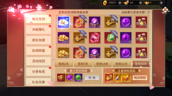 2、签到、冲级赠豪礼。神兽坐骑、时装通通可以拿下