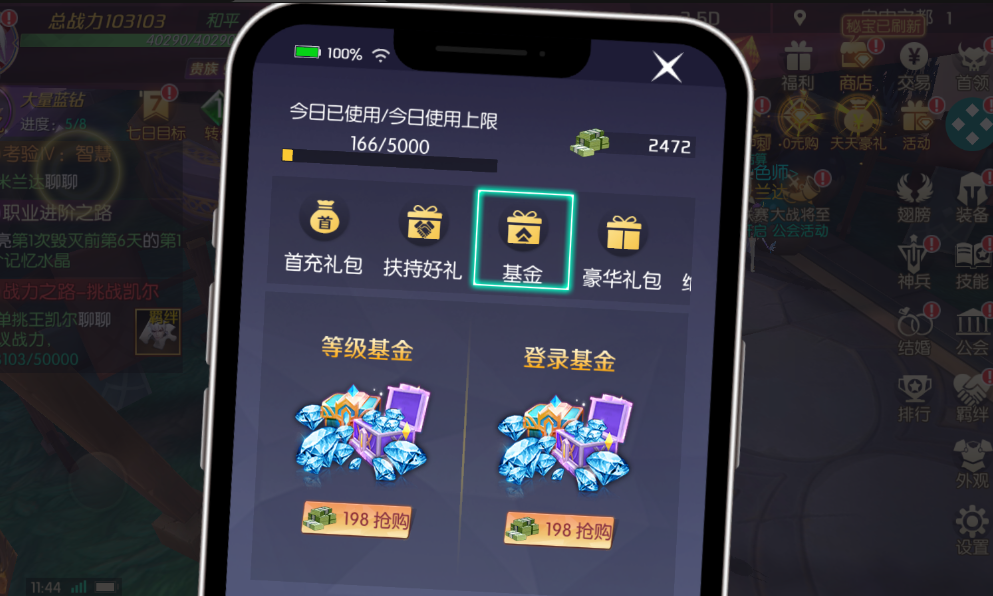扶持工具,每日领648充值,购买特权礼包、基金,战力瞬间飙升。