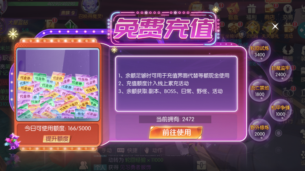 免费刷充工具,做任务,打首领,刷副本都能获得充值余额,天天刷充值,可购买打金特权提高使用额度。