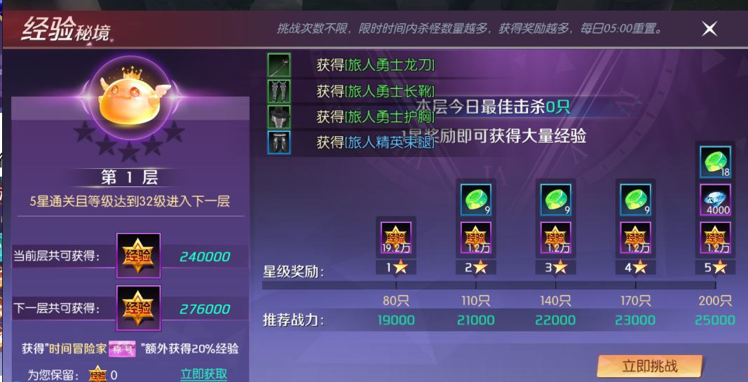 经验秘境,是获取经验最主要的途径,获得时间冒险家称号可以获得20%经验,不可错过