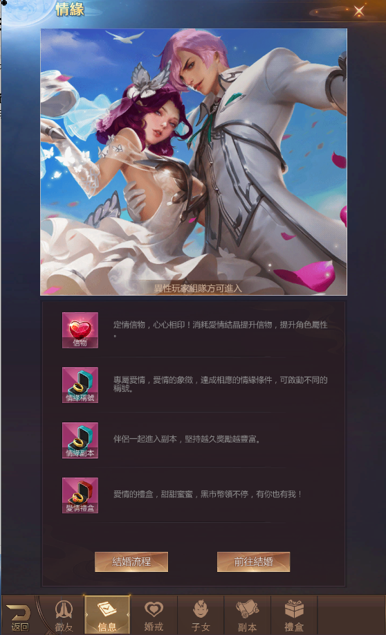 1、情缘双方亲密度大于99时,玩家之间可以前往结婚