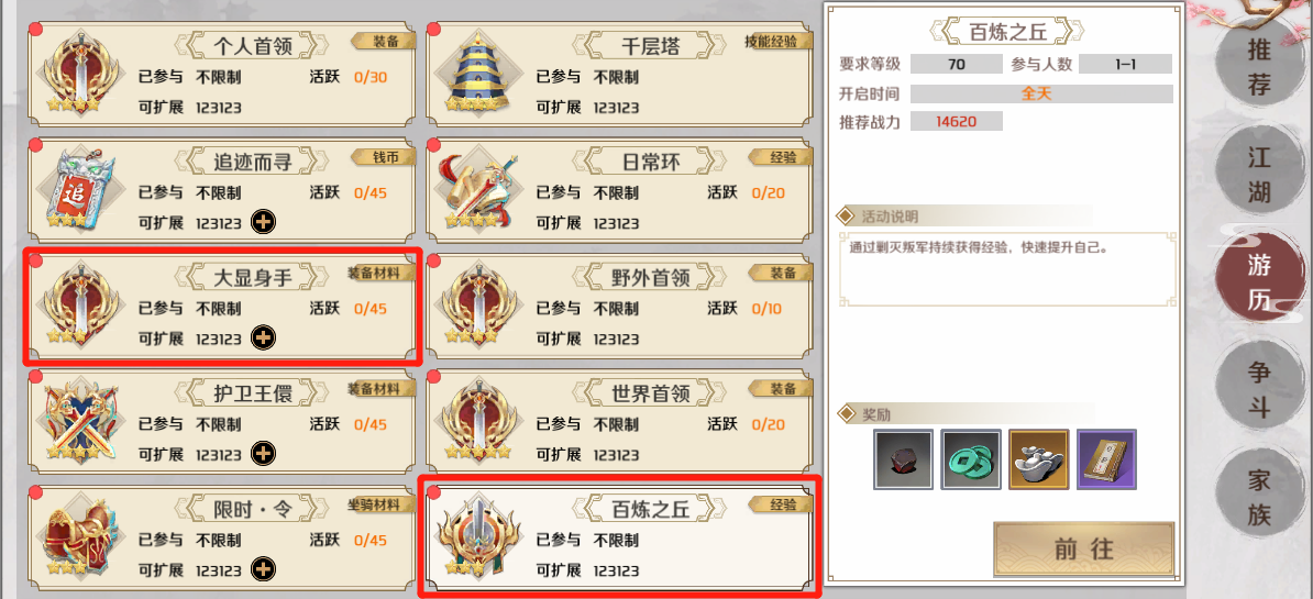 接着,再点击游历。一堆活动跳出来,是不是要花缭乱了。不要急,我来告诉你。