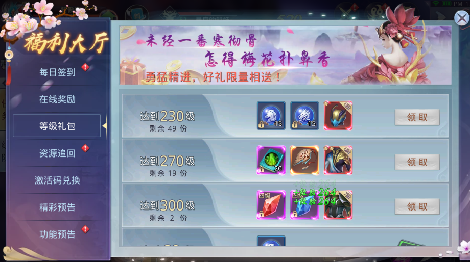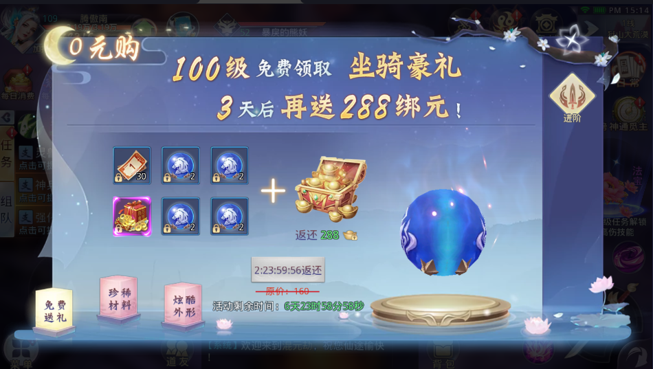 2、签到、冲级、战斗赠豪礼。7阶装备、金色翅膀、0元购通通可以拿下