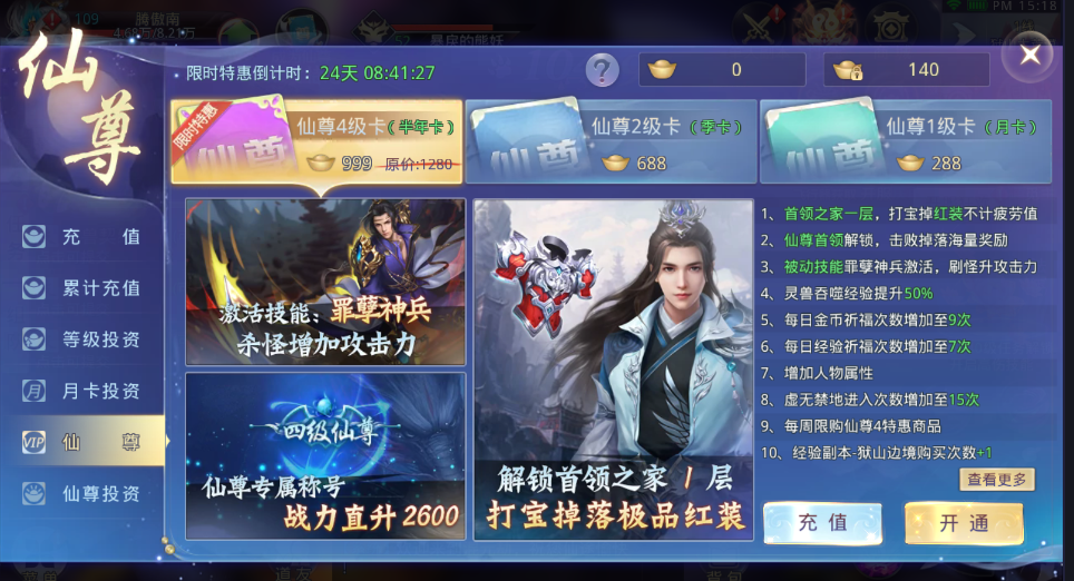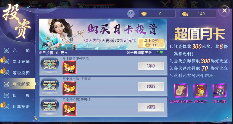 2、月卡、仙尊卡。微氪党必备,性价比极高