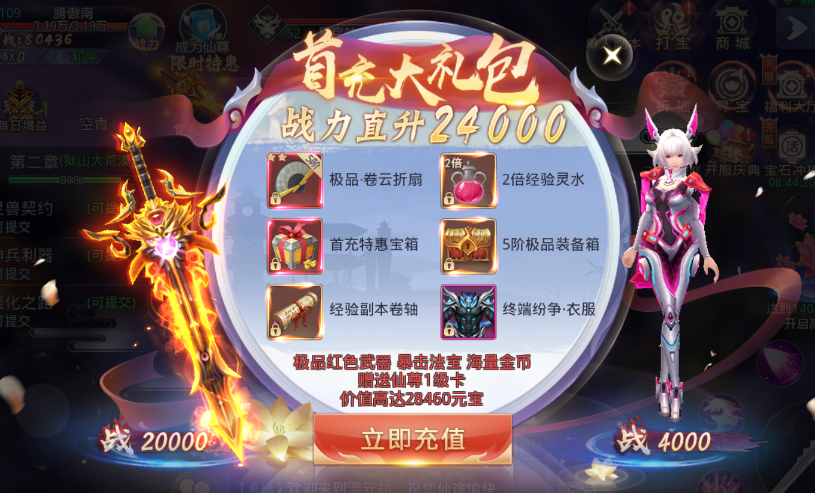 1、首充送极品红色武器 暴击法器 经验灵水 。升级战力快人一步。
