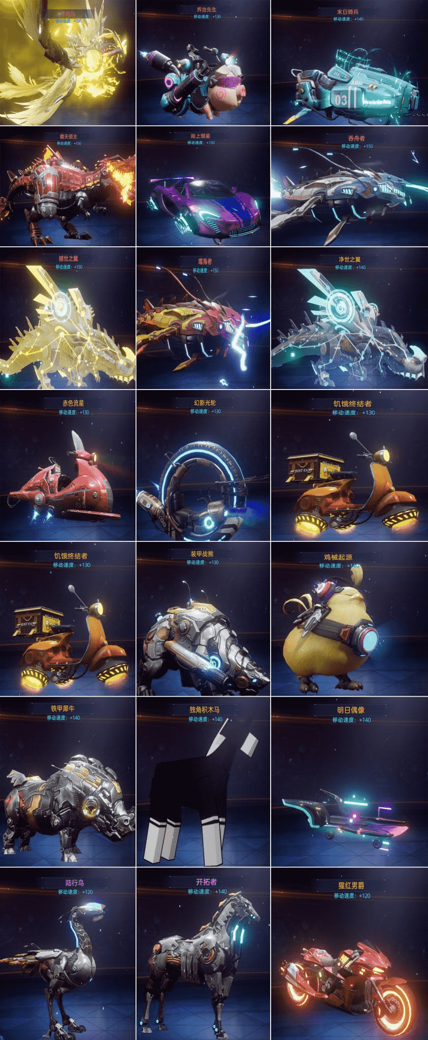 载具每个都可以增加玩家的移动速度,从120到150不等,每款载具也会有对应的激活属性的作用。玩家收集越多载具加成属性越多,多款载具的属性和技能都是可以叠加到一起的。