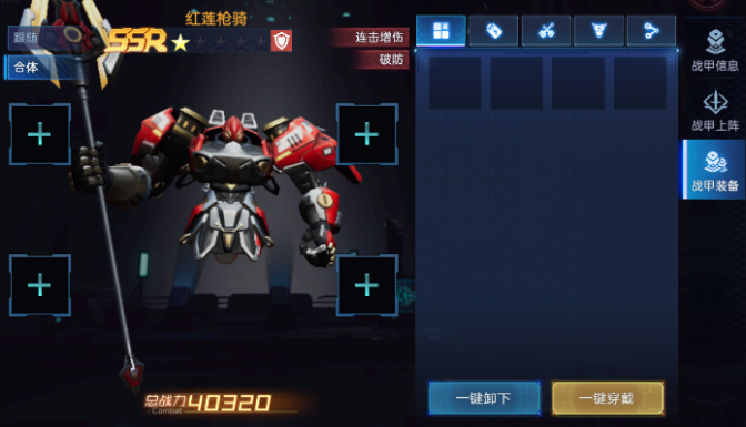 每个战甲自身携带的技能都不相同,可以根据角色的需求搭配相应的出战战甲阵容。
