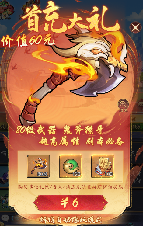 微氪玩家可以把首冲买了,拿一个80级金色武器,前期过得就更舒服了,玩家任务活动获得的仙玉先不要去用,后面攒起来了再看看需求去使用。