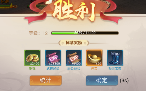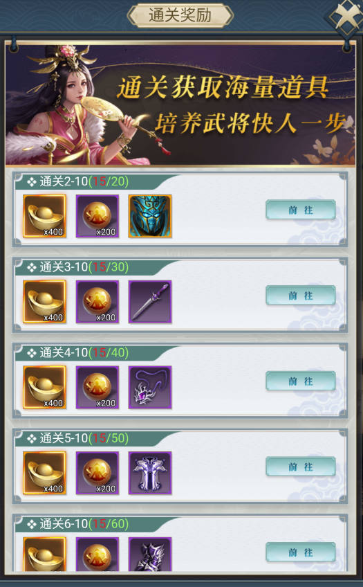 通关奖励,玩家通过关卡后会获得橙色武将和稀有材料!