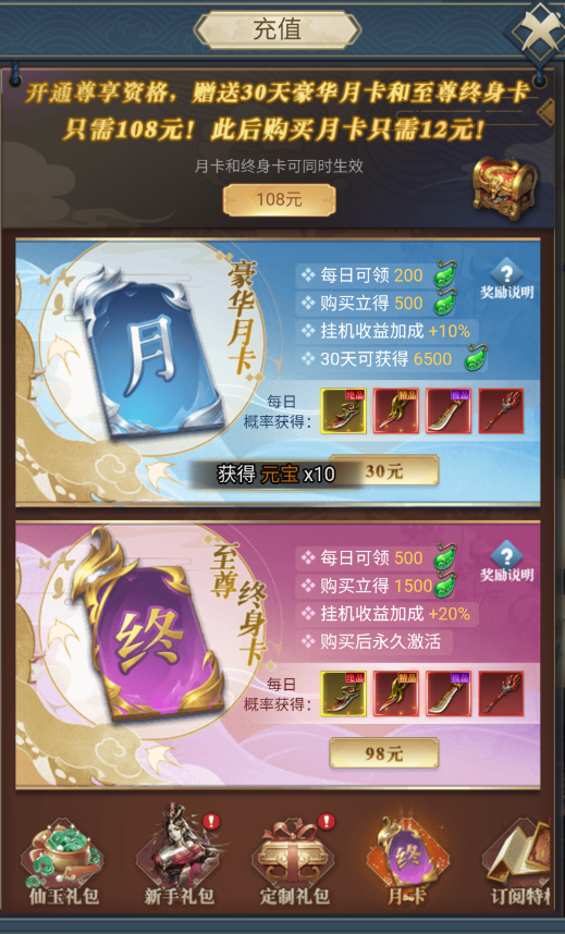 超值月卡,终身卡,每日可获得仙玉还有挂机加成哦!