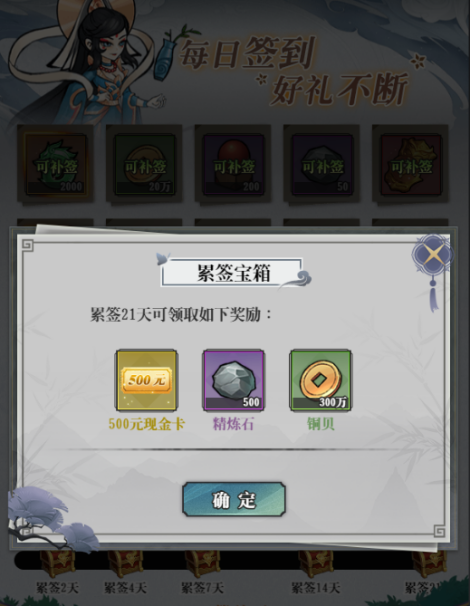 累计签到2天送100元现金卡,累计签到4天送200元现金卡,累计签到7天送300元现金卡,累计签到14天送400元现金卡,累计签到21天送500元现金卡!