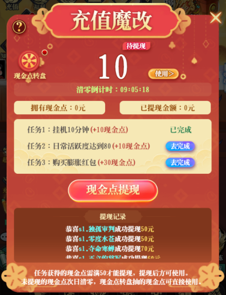 每日登录、每日在线免费抽现金点数量,获得的现金点可以全额抵扣一系列付费活动,不花钱也能体验真实付费。激活新手特权额外再送1次免费抽奖,每日完成任务也能活动50元现金点,激活养老特权每天也能免费领50元现金点,高返利,钱花在刀刃上!