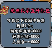 (3)【绝世武学直升】礼包(可在以下奖励中任意选择1个:游龙降魔掌*6000,神剑六道*6000,人剑合一*6000),直升150级礼包