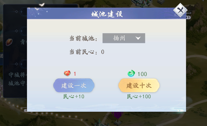 点开城池信息,可看到建设王城的选项,点击后就会弹出建设窗口。有使用民心所向道具和灵玉两种形式可进行建设。而民心所向道具可以通过搬砖,砍雕像,砍大旗活动获得。