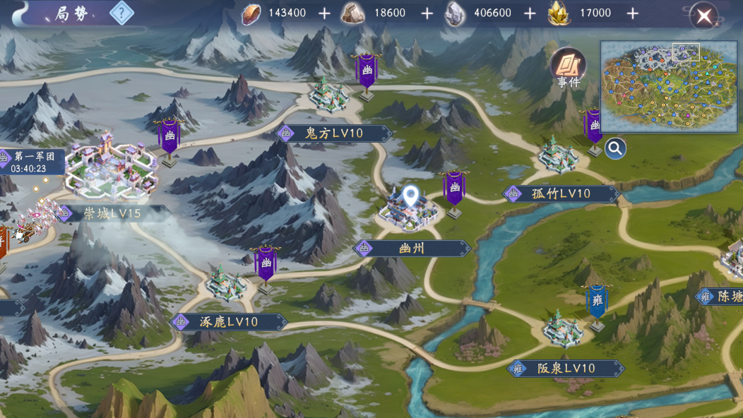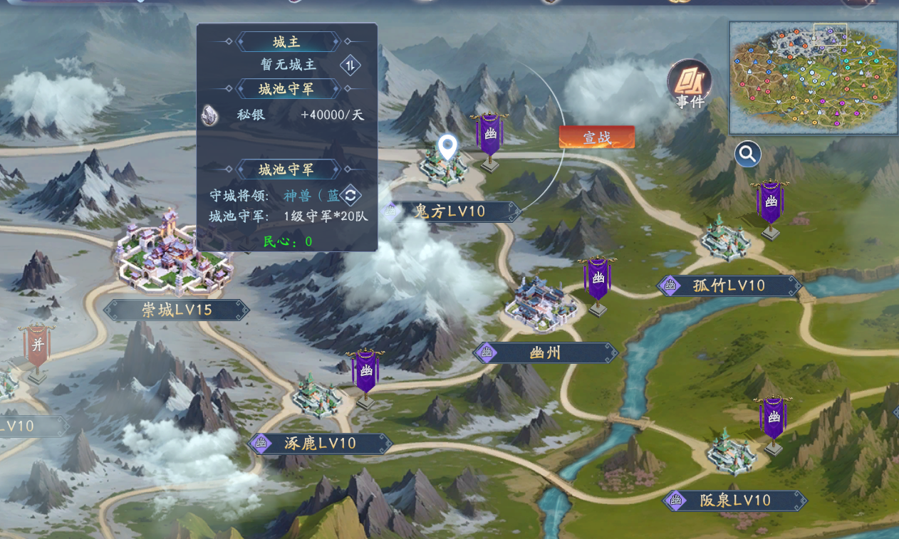 首先我们打开征战,就可以看见2D局势图,我以为幽州为例,通过观察我们可以发现,幽州主城与鬼方、孤竹、逐鹿、阪泉四个城池的相邻的